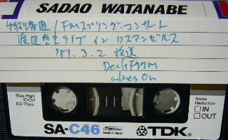○ムズーリ ○サンダンス ○ナイス・ショット ○アップ・カントリー ○ボアノイチ ○カリフォルニア・シャワー ○つま恋 ○オール・アバウト・ラブ ○M&Mスタジオ ○マイ・ディア・ライフ メンバー紹介したのかな? 控えてないので、 もう一度聞いてみないと分からないです。 1月1日に放送されたの↓と似たようなメンバーかも。 http://musicmedia.blog.shinobi.jp/Entry/948/ このライブ放送の録音には↑の写真のテープも使っています。 PR |