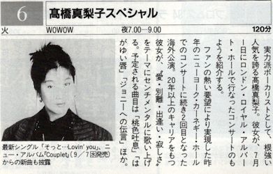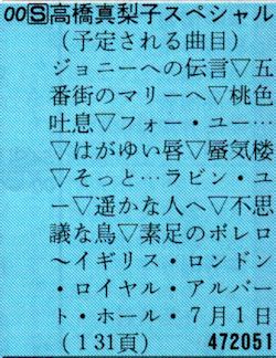 ○ ○ ○ ○ ○ ○ ○ ○ ○ ○ 高橋真梨子 7月1日、ロンドン・ロイヤル・アルバート・ホールにて 見ただけ? テープが見当たらないので。 確認のしようがないので以下に当時のTV番組掲載誌からの番組表を。